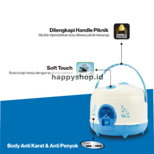 Kapasitas beras: 1,2 liter — menghasilkan nasi hingga ± 3,2 liter atau sekitar 10 porsi (±200 g per porsi). Daya listrik: 315 W pada tegangan 220 V. Fungsi: “3-in-1” → memasak, menghangatkan & mengukus. Panci (inner pot) menggunakan lapisan non-stick / khusus (“Nanoal” atau “Nanoal Berlian Hitam” pada varian tertentu) yang diklaim anti lengket lebih tahan lama, aman („food grade“, bebas PFOA) dan mudah dibersihkan. Fitur tambahan: body anti karat & anti penyok, soft-touch opening, thermostat system untuk menjaga nasi tetap hangat & tidak mudah basi. Cocok untuk keluarga kecil atau penggunaan harian dengan kapasitas sedang. Miyako MCM-512C Magic Warmer Plus Miyako Rice cooker 1,2 liter Miyako Rice cooker 3-in-1 Miyako Panci Nanoal Miyako Rice cooker anti lengket Miyako Penanak nasi Miyako kapasitas 10 porsiRp214,000 -