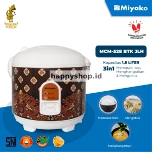 Miyako Mcm 528 BTK JLH Kapasitas beras: 1,8 liter. Kapasitas nasi setelah dimasak: 5 liter. Dinyatakan mampu menyajikan sekitar ± 15 porsi (asumsi 200 gram per porsi). Jadi, produk ini cocok untuk sekitar 15 porsi nasi dalam satu kali masak (jika setiap porsi diukur ~200 g nasi). 📝 Spesifikasi Singkat Fungsi 3-in-1: memasak, menghangatkan, mengukus. Daya listrik: 395 W. Bodi material: Tin Plate. Panci / Inner pot: Non-stick (anti lengket) dan food grade. Motif: Batik “BTK” (BTK = Batik) edisi khusus motif jalak harupat dan sebagainya. Garansi: Elemen pemanas hingga 5 tahunRp245,000 -