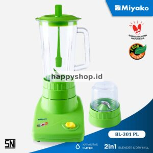 Blender Miyako BL-301 P Blender Miyako BL-301 PL dengan warna hijau yang khas ini memiliki fitur ICE CRUSHER yang dapat menghancurkan es batu tanpa menggunakan air sekalipun. Mata pisau terbuat dari material stainless steel 304 yang anti karat, awet dan lebih hygienis. Material tabung Blender Miyako BL-301 PL terbuat dari Acrylonitrile Styrene yaitu material plastik yang sudah Food Grade sehingga tidak berbahaya jika bersentuhan dengan bahan konsumsi manusia. Blender Miyako BL-301 PL juga telah dilengkapi dengan fitur thermostat yang memutus arus listrik jika terjadi beban berlebih sehingga lebih aman karena dapat mengurangi resiko korsleting listrik. Perlu diketahui, fitur Thermostat ini mematikan arus listrik jika terjadi beban berlebih dan Blender bisa digunakan kembali seperti sedia kala jika temperatur motor telah dalam keadaan normal, biasanya waktu pendingan yang dibutuhkan sekitar 10 menit. Blender Miyako BL-301 PL memiliki fungsi 2 in 1. Dilengkapi dengan tabung blender berkapasitas 1 liter yang memudahkan Anda membuat beraneka ragam jus, serta tambahan 1 tabung dry mill yang berfungsi menghaluskan bumbu – bumbu kering seperti ketumbar, lada dan lain sebagainya. Tombol on / off yang mudah dan sangat praktis digunakan dengan konsumsi daya hanya sebesar 250 Watt. Blender Miyako BL-301 PL juga telah mendapatkan sertifikat SNI sehingga terjamin keamanan dan kualitasnya.Rp183,000 -