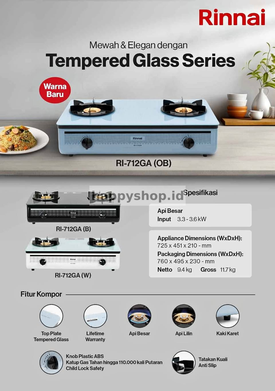Kompor gas dua tungku RI-712GA, kompor elegan berwarna hitam ini dengan top plate yang terbuat dari bahan schott glass yang kuat. Selain itu, kompor ini mudah digunakan dan mudah dibersihkan, sehingga kompor ini tidak membutuhkan perawatan ekstra. Dengan dua tungku yang tersedia, Anda dapat memasak sekaligus dua masakan, dengan pengaturan besar kecil api yang dapat Anda sesuaikan. Kompor ini cocok untuk dapur keluarga sehingga terkesan minimalis dan elegan.